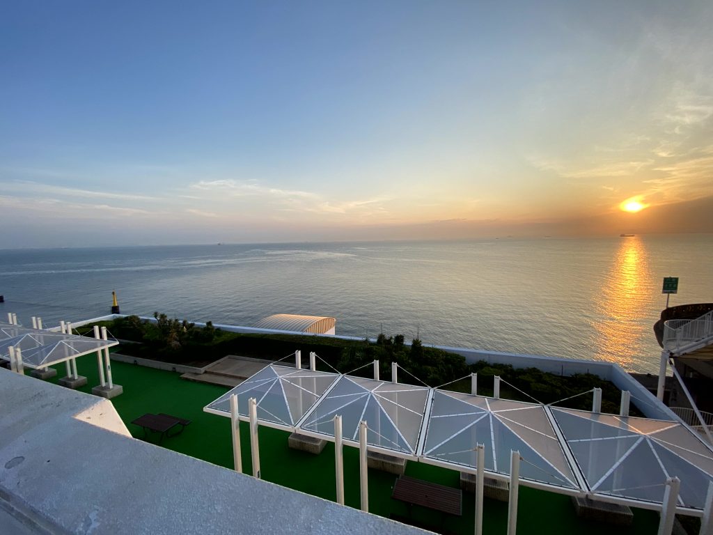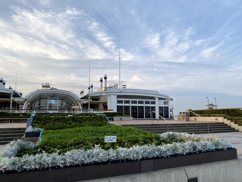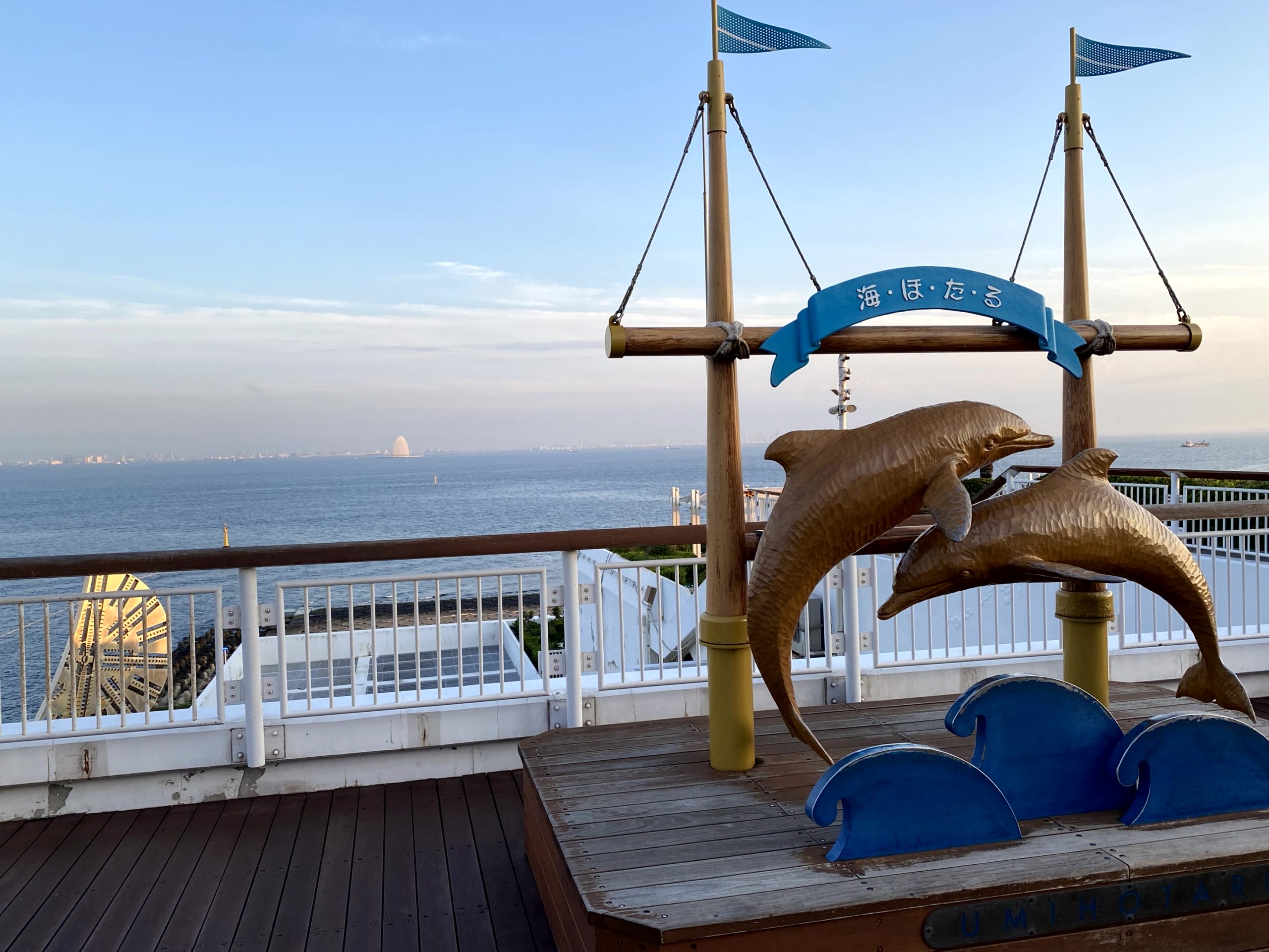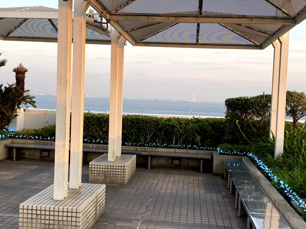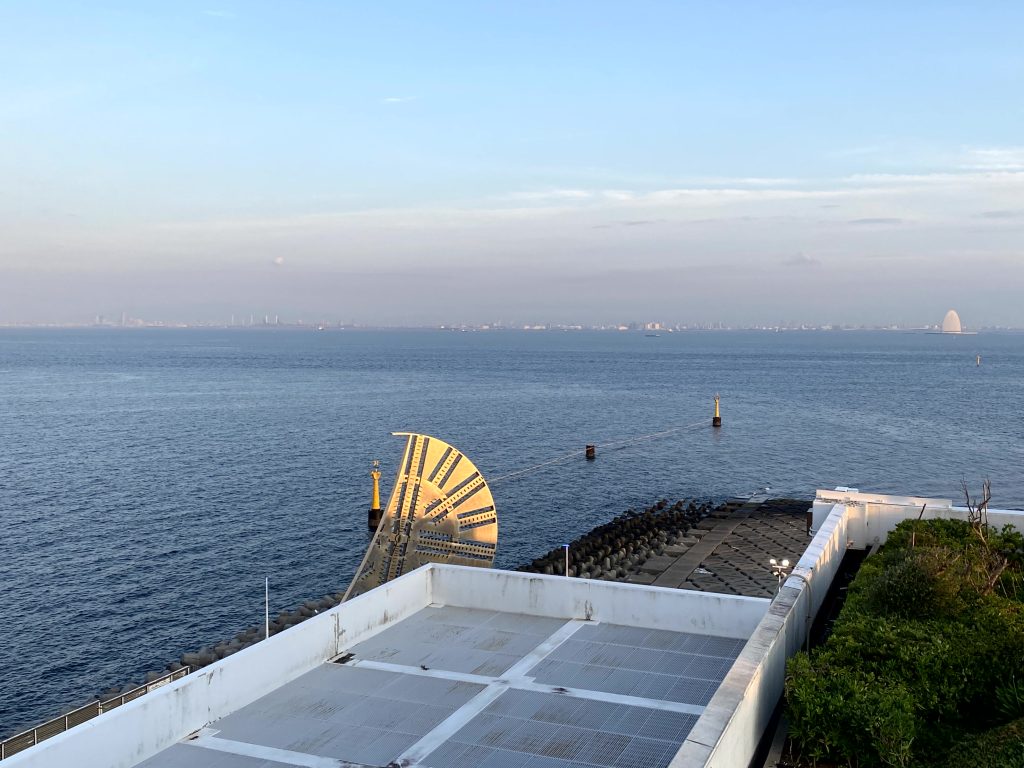 東京湾に浮かぶ「海ほたるパーキングエリア」。東京湾の風景をぐるり見渡せます。東京湾アクアライン上にポツンと浮かぶ白い島が「風の塔」。※海ほたるPAは東京・千葉のお土産が揃っています。